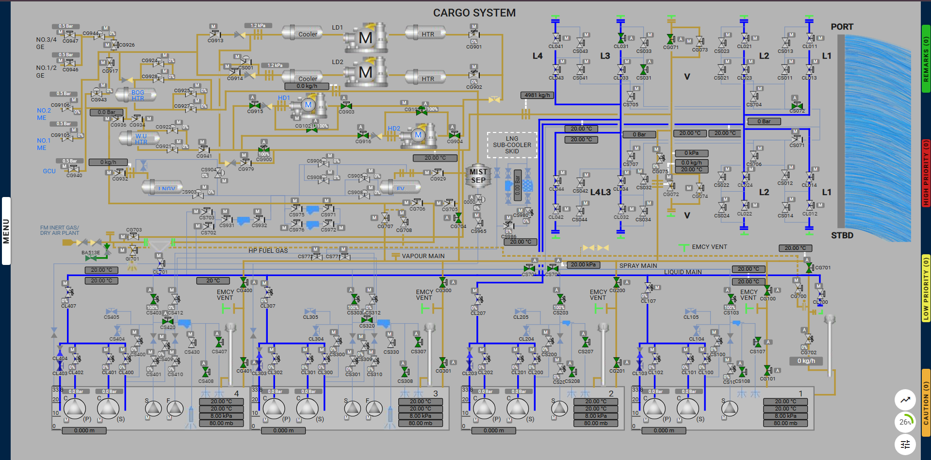 This exercise focuses on the operation of cooling down cargo tanks onboard an LNG carrier. The exercise begins with all tanks in a “gassed-up” condition, where the atmosphere inside the tanks is fully filled with LNG vapor.