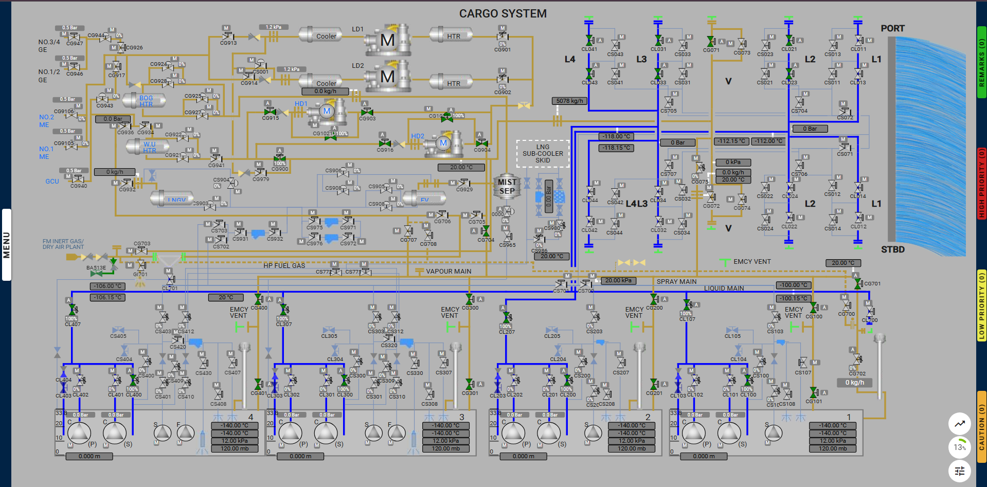 This operation is carried out after the liquid line cool-down has been completed. The user is tasked with performing the initial two hours of the LNG loading operation. During this operation, the user ramps up the flow from the shore and loads LNG into the cargo tanks in stages. The goal is to increase the flow from 0 to 10,000 m³ per hour while ensuring that the tank levels are staggered so that all tanks do not reach their full capacity at the same time.