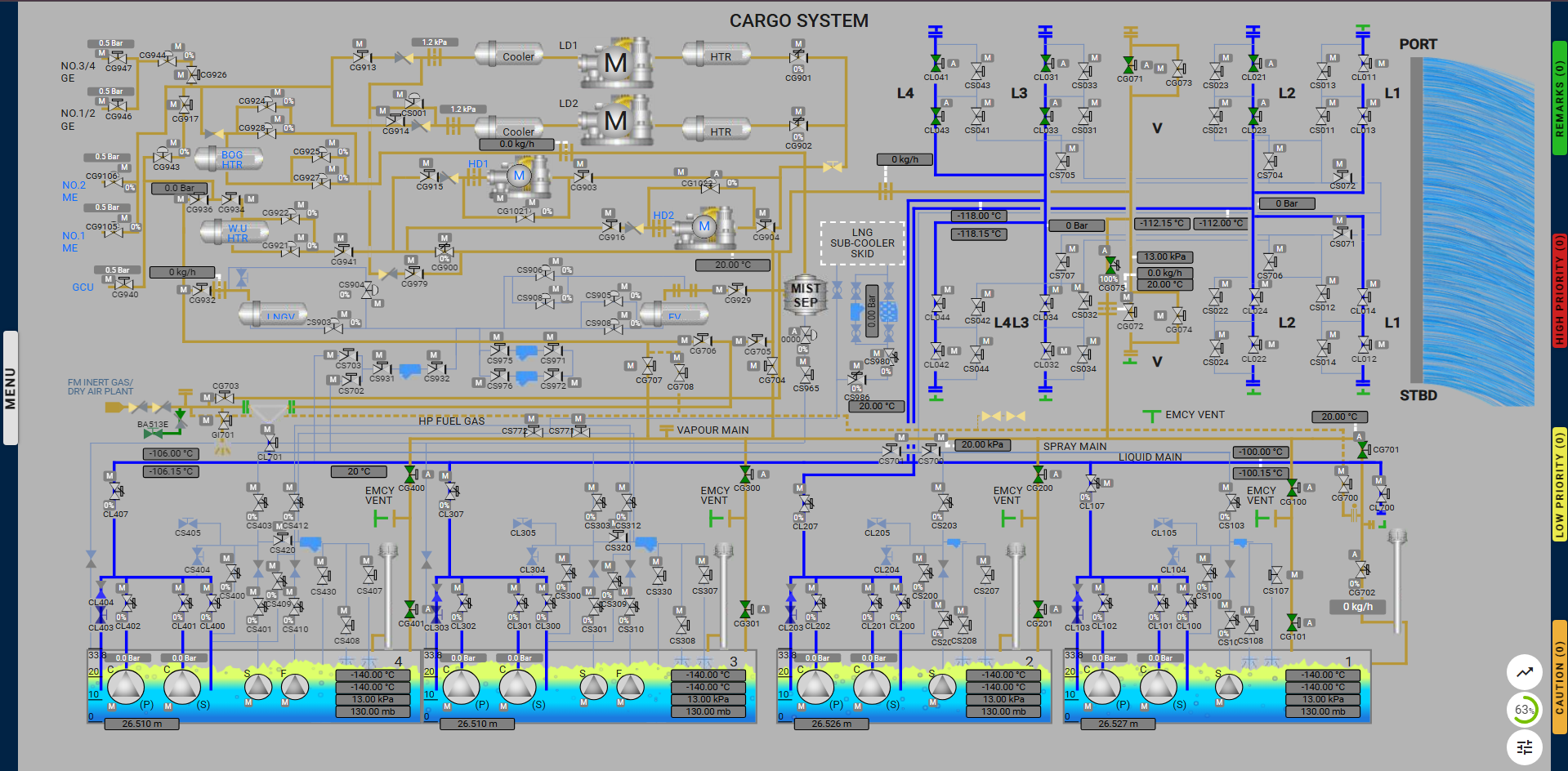 The Discharging with Heel operation is carried out onboard an LNG carrier when the vessel arrives at the discharge port. The goal of this operation is to discharge the required amount of LNG using the cargo pumps and systems, while leaving a small amount of LNG (the “heel”) in the tanks for safety and operational purposes. This exercise is the first part of the discharging operation, where the user starts the discharging process and ensures a staggered discharge between different tanks.