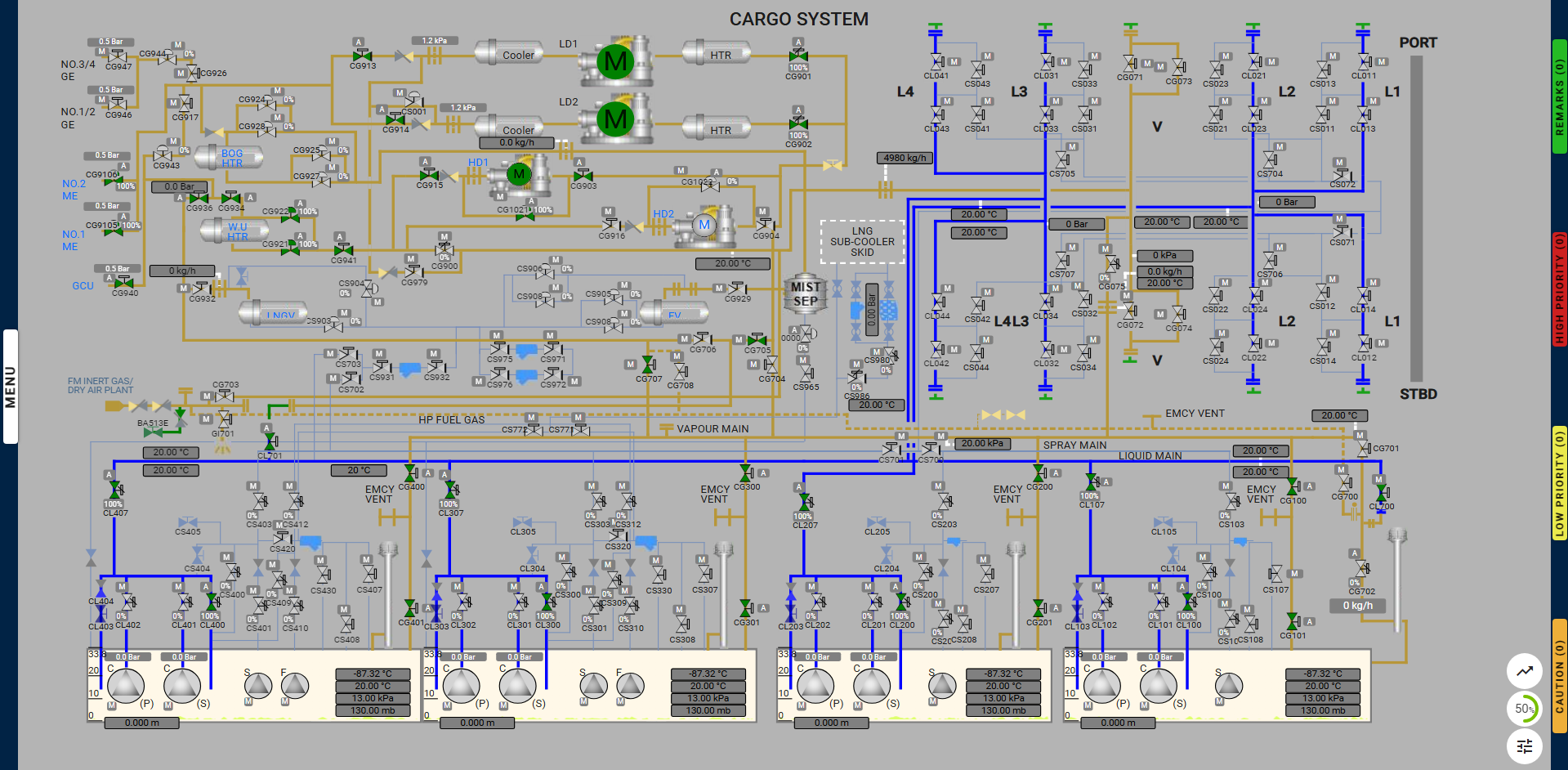 The warming up of cargo tanks is performed in preparation for an upcoming dry dock. This operation is carried out after the tanks have been emptied using the spray pumps. The primary objective is to make the tanks free of liquid and to warm the LNG vapor inside the tanks.