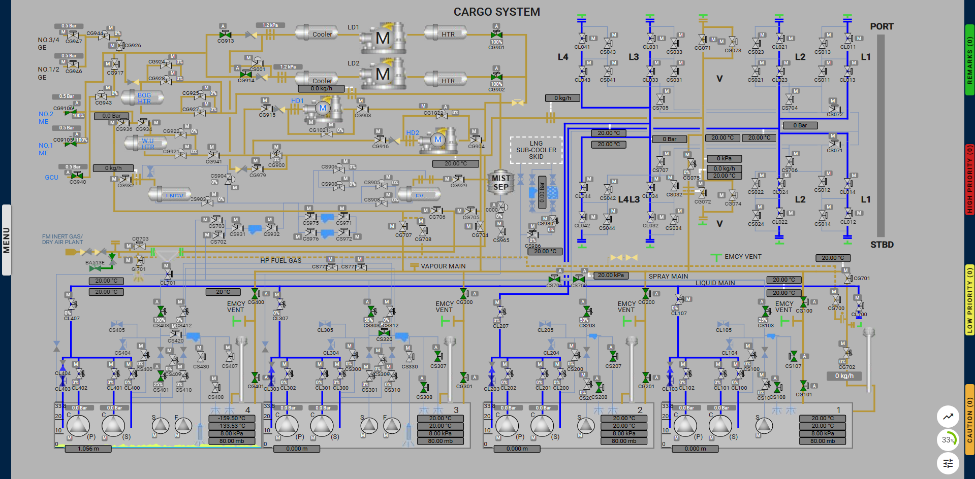 The assessment begins once the lineup is complete and all equipment is ready for operation. The LNG flow is started from the spray pump, and the user must achieve a temperature of -130°C inside the tanks. Throughout the assessment, the user must maintain the correct LNG flow in order to achieve the temperature drop in the requisite time period and respond to any rising tank pressure by operating the LD compressor appropriately. The Gas Combustion Unit is put on standby in case required.